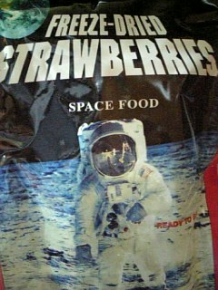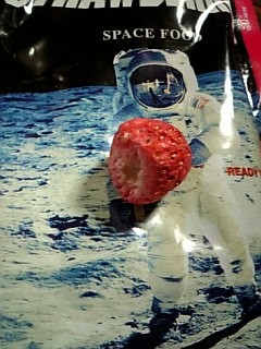 「宇宙」 宇宙と言えば。 宇宙食。違 というわけで手に入れました。 宇宙で食べるイチゴ! 開けるとこんな感じ。 ↑上手いぐあいに、宇宙飛行士が収穫したみたいに撮れました(笑) そんで味ですが・・・・ アレ。 ホワイトチョコレートで包まれてるやつ。 の中身(笑) 中身だけだとチョットすっぺー(笑) やっぱ俺は地球でイチゴ食べることにするよ☆